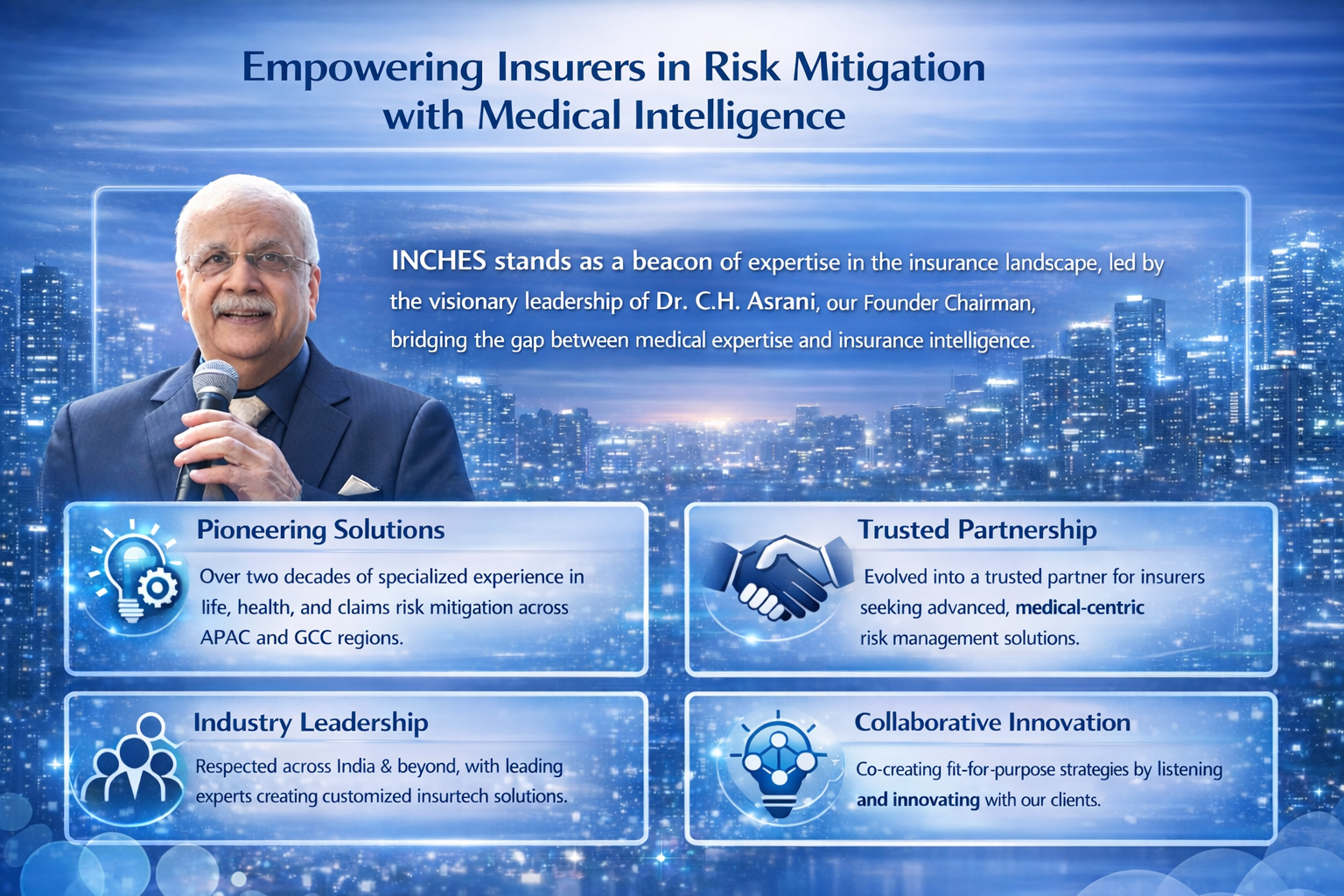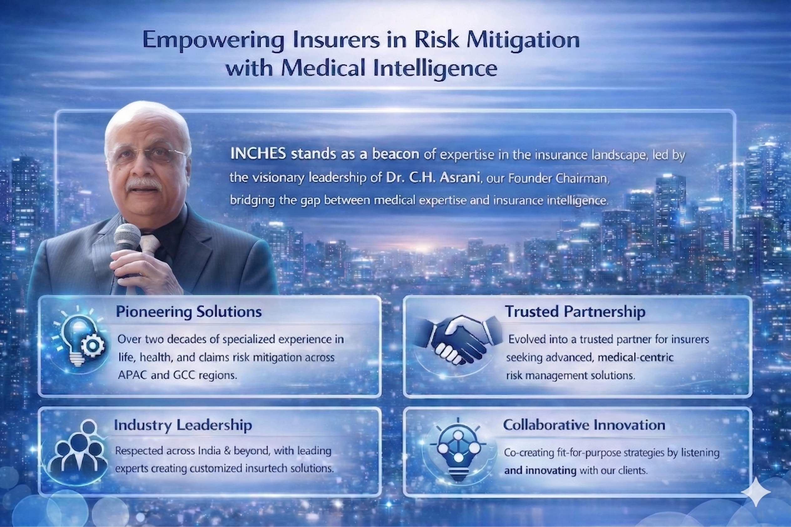 INCHES stands as a beacon of expertise in the insurance landscape, founded with an unwavering commitment to transforming how insurers approach risk mitigation. Under the visionary leadership of Dr. C.H. Asrani, our Founder Chairman, we have carved a distinctive niche by bridging the gap between medical expertise and insurance intelligence.